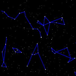 - Achernar (α Eridani) est isolée et très brillante, dans la zone australe pratiquement polaire. Isolée et brillante, c'est un repère important d'alignements dans l'hémisphère Sud, mais qui ne peut pas être identifié par la forme locale des constellations, ni par ses alignements.