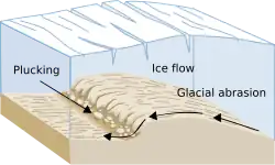 - l'abrasion du sous-sol par les matériaux incorporés dans la glace basale du glacier. Elle s'opère selon deux modes, la striation (creusement de sillons et cannelures parallèles à la direction d'écoulement de la glace), et le polissage. Lorsque l'abrasion mécanique de la roche par le glacier forme une poudre très fine (limon < 50 μm), il se forme de la farine glaciaire ;