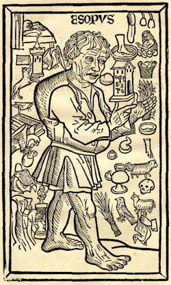 « Ésope était le plus laid de ses contemporains ; il avait la tête en pointe, le nez camard, le cou très court, les lèvres saillantes, le teint noir, d’où son nom qui signifie nègre ; ventru, cagneux, voûté, il surpassait en laideur le Thersite d’Homère ; mais, chose pire encore, il était lent à s’exprimer et sa parole était confuse et inarticulée[10]. »