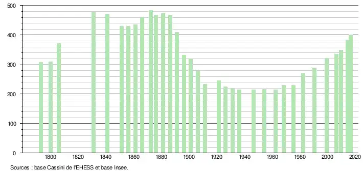 L'évolution du nombre d'habitants est connue à travers les recensements de la population effectués dans la commune depuis 1793. Pour les communes de moins de 10 000 habitants, une enquête de recensement portant sur toute la population est réalisée tous les cinq ans, les populations de référence des années intermédiaires étant quant à elles estimées par interpolation ou extrapolation[7]. Pour la commune, le premier recensement exhaustif entrant dans le cadre du nouveau dispositif a été réalisé en 2004[8].