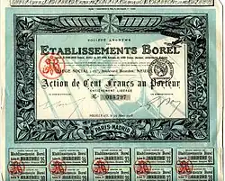 - ↑ Avec comme capital 500 000 francs. Le PDG Gabriel Borel, reste le plus souvent à Paris où l'entreprise a son siège social. Il détient un capital de 250 actions.