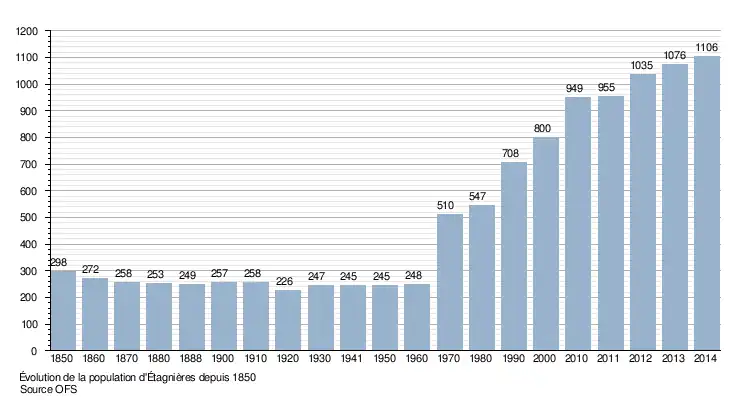 La population d'Étagnières est de 298 habitants en 1850. Elle baisse à 258 personnes vingt ans plus tard, puis reste stable jusqu'en 1960. Le nombre d'habitants augmente très fortement depuis, puisqu'il est presque multiplié par quatre en 50 ans, jusqu'à 949 en 2010. Le graphique suivant résume l'évolution de la population d'Étagnières entre 1850 et 2014[14] :