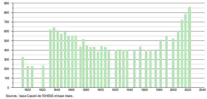 L'évolution du nombre d'habitants est connue à travers les recensements de la population effectués dans la commune depuis 1793. Pour les communes de moins de 10 000 habitants, une enquête de recensement portant sur toute la population est réalisée tous les cinq ans, les populations de référence des années intermédiaires étant quant à elles estimées par interpolation ou extrapolation[27]. Pour la commune, le premier recensement exhaustif entrant dans le cadre du nouveau dispositif a été réalisé en 2006[28].