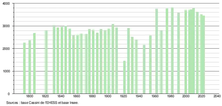- ↑ Fiches Insee - Populations de référence de la commune pour les années 2006, 2007, 2008, 2009, 2010, 2011, 2012, 2013, 2014, 2015, 2016, 2017, 2018, 2019, 2020, 2021 et 2022.