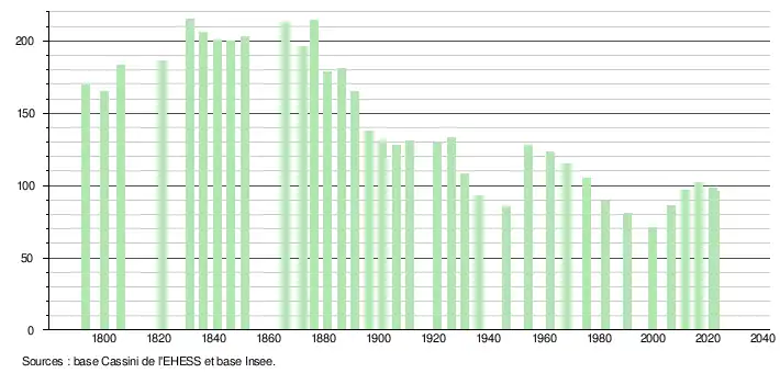 L'évolution du nombre d'habitants est connue à travers les recensements de la population effectués dans la commune depuis 1793. Pour les communes de moins de 10 000 habitants, une enquête de recensement portant sur toute la population est réalisée tous les cinq ans, les populations de référence des années intermédiaires étant quant à elles estimées par interpolation ou extrapolation[22]. Pour la commune, le premier recensement exhaustif entrant dans le cadre du nouveau dispositif a été réalisé en 2006[23].