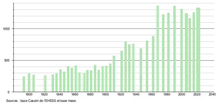 L'évolution du nombre d'habitants est connue à travers les recensements de la population effectués dans la commune depuis 1793. Pour les communes de moins de 10 000 habitants, une enquête de recensement portant sur toute la population est réalisée tous les cinq ans, les populations de référence des années intermédiaires étant quant à elles estimées par interpolation ou extrapolation[22]. Pour la commune, le premier recensement exhaustif entrant dans le cadre du nouveau dispositif a été réalisé en 2005[23].