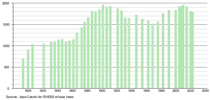 L'évolution du nombre d'habitants est connue à travers les recensements de la population effectués dans la commune depuis 1793. Pour les communes de moins de 10 000 habitants, une enquête de recensement portant sur toute la population est réalisée tous les cinq ans, les populations de référence des années intermédiaires étant quant à elles estimées par interpolation ou extrapolation[17]. Pour la commune, le premier recensement exhaustif entrant dans le cadre du nouveau dispositif a été réalisé en 2004[18].