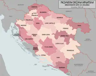 Le territoire de l'État indépendant de Croatie englobe toute la Bosnie-Herzégovine, des portions de la Serbie actuelle (Syrmie, peuplée pour moitié par des Serbes, et une partie de la Voïvodine) et la majeure partie de la Croatie actuelle, amputée de l'Istrie et d'une large partie de la Dalmatie, annexées à l'Italie. Divisé en zones d'occupation allemande et italienne, le régime dictatorial de Pavelić commença par abolir le Parlement croate en pourchassant toute opposition.