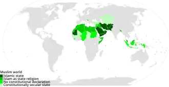 De nombreux pays à majorité musulmane font de l'islam leur religion d'État mais les conséquences d'une telle reconnaissance varient d'un pays à l'autre. Plus globalement, l'Organisation de la Coopération Islamique (OIC/OCI) regroupe actuellement 57 États.