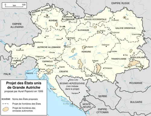 L’archiduc François-Ferdinand, trouvant séduisante l’idée d’Aurel Popovici, avait prévu de redessiner la carte de l’Autriche-Hongrie en créant neuf « États » semi-autonomes (quinze avec les enclaves), qui formeraient une plus large confédération appelée « États unis de Grande-Autriche ». Selon ce plan, l’identité linguistique et culturelle était encouragée comme richesse d’un Empire multiculturel facteur d’apaisement des nationalismes[5], et les disparités de pouvoir au sein de chaque entité seraient rectifiées d’une manière ou d’une autre. Le plan allait plus loin que les revendications des différents peuples, car il ne se limitait pas à donner plus d’autonomie aux composantes existantes de l’Empire, mais redessinait leurs frontières de manière à regrouper au sein d’une même entité le maximum de locuteurs d’une même langue (voir cartes).