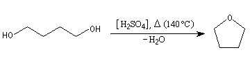 Le tétrahydrofurane (THF) (voir ci-dessous) est ainsi synthétisé généralement grâce au butane-1,4-diol mis en présence de l'acide sulfurique.