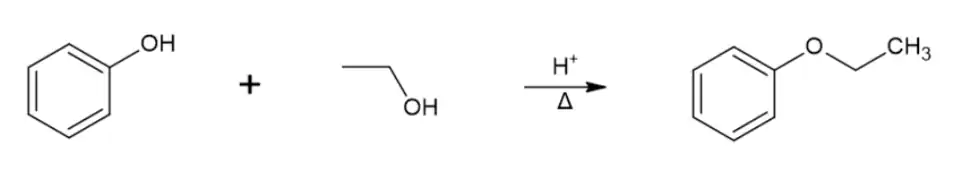 Cependant, comme toute synthèse croisée d'éther-oxydes (avec deux alcools différents), il y a risque de formation de sous-produits indésirés, en particulier par des phénomènes d'auto-condensation de l'alcool (par exemple, l'éthanol s'auto-condensant pour former de l'éther diéthylique). Une réaction plus utilisée car à meilleur rendement est la synthèse de Williamson, dans laquelle un phénol est converti par une base forte en ion phénolate, qui peut ensuite réagir avec un halogénure d'alkyle via une substitution nucléophile pour former l'éther de phénol désiré. Pour cette réaction, les halogénures d'alkyle primaires fonctionnent mieux, les halogénures d'alkyle secondaires et tertiaires ayant tendance à réagir par élimination bimoléculaire[5]. Cette synthèse d'éther supprime le risque d'auto-condensation et les rendements peuvent atteindre 95 % en laboratoire.