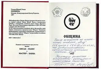 • Un des livres de l’Éthique Vivante, La Communauté s’était trouvé au bord de la station orbitale " Paix " dans la période du à . Ce fait est attesté par les sceaux officielles de la station " Paix " et par la signature du commandant de l’équipage cosmique russe-américain-français, le pilote cosmonaute — Talgat Moussabaev.
