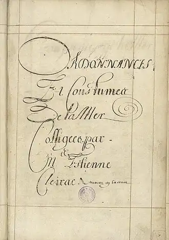 - ↑ Estienne Cleirac, Troisiesme partie des us et coutumes de la mer, contenant la Jurisdiction de la Marine ou d'Amirauté, tant en temps de Paix qu'en temps de Guerre (lire en ligne)