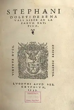 - ↑ « Étienne Dolet (1509-1546), l'encre et le feu », bibliothèque municipale de Lyon, exposition du 12 novembre 2009 au 5 janvier 2010.