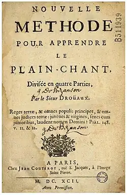 - Nouvelle méthode pour apprendre le plain-chant, divisée en quatre parties. Par le sieur Drouaux. - Paris : Jean Couterot, 1692. 8°, 188 p. Lescat 1991 n° 7e. Paris BnF (Ars.) : 8-S-14439, Lyon BM : B 511939, Rouen BM.