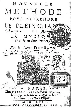 - Nouvelle méthode pour apprendre le plein-chant et la musique divisée en deux parties, Par le sieur Drouaux. - Paris : Robert III Ballard, 1672. 4°, 63-[1] p. Châlons-en-Champagne BM : AF 18186. Guillo 2003 n° 1672-C.