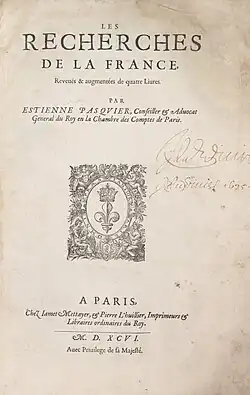 - Les Recherches de la France d'Estienne Pasquier, conseiller et advocat général du Roy en la Chambre des comptes de Paris augmentée en ceste dernière édition de trois livres entiers, outre plusieurs chapitres entrelassez entre chacun des autres livres, tirez de la bibliothèque de l'autheur, chez Laurens Sonnius, Paris, 1621 (lire en ligne).
