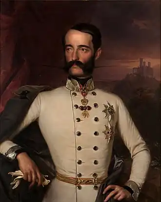 Membre de l’armée impériale autrichienne, l'archiduc Étienne est nommé gouverneur civil de la Bohême par l’empereur Ferdinand Ier d’Autriche en décembre 1843. À la mort de son père, en 1847, toute la famille du défunt quitte la Hongrie, hormis l'archiduc Étienne qui hérite du titre et de la fonction de comte palatin de Hongrie, soit de représentant de l'empereur dans le royaume[2].
