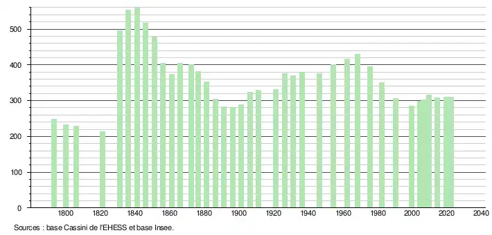 L'évolution du nombre d'habitants est connue à travers les recensements de la population effectués dans la commune depuis 1793. Pour les communes de moins de 10 000 habitants, une enquête de recensement portant sur toute la population est réalisée tous les cinq ans, les populations de référence des années intermédiaires étant quant à elles estimées par interpolation ou extrapolation[31]. Pour la commune, le premier recensement exhaustif entrant dans le cadre du nouveau dispositif a été réalisé en 2004[32].