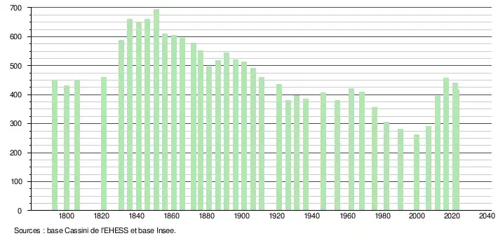 L'évolution du nombre d'habitants est connue à travers les recensements de la population effectués dans la commune depuis 1793. Pour les communes de moins de 10 000 habitants, une enquête de recensement portant sur toute la population est réalisée tous les cinq ans, les populations de référence des années intermédiaires étant quant à elles estimées par interpolation ou extrapolation[40]. Pour la commune, le premier recensement exhaustif entrant dans le cadre du nouveau dispositif a été réalisé en 2006[41].