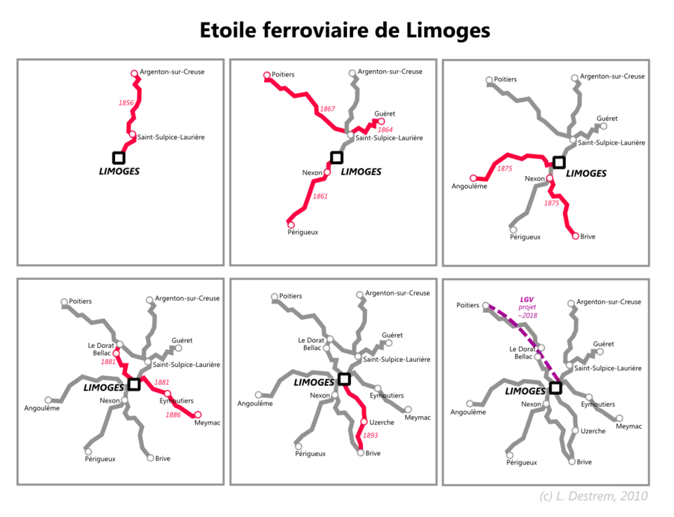 Cinq ans plus tard, Limoges cesse d'être un cul-de-sac ferroviaire avec la création de la ligne vers Périgueux. En 1864 puis 1867, deux autres branches se connectent à la première à partir de la gare de Saint-Sulpice-Laurière, permettant la circulation de trains depuis Limoges par Saint-Sulpice vers Guéret d'une part, et Le Dorat et Poitiers d'autre part.