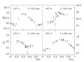 - ↑ (en) P. R. Wood, « Variable Red Giants in the LMC: Pulsating Stars and Binaries? », Publications of the Astronomical Society of Australia, vol. 17, , p. 18 (DOI 10.1071/AS00018, Bibcode 2000PASA...17...18W)