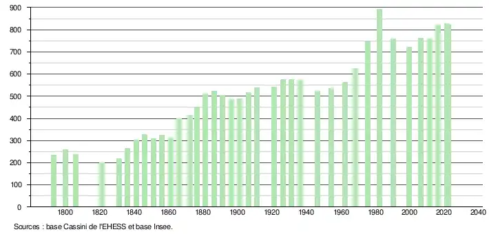 L'évolution du nombre d'habitants est connue à travers les recensements de la population effectués dans la commune depuis 1793. Pour les communes de moins de 10 000 habitants, une enquête de recensement portant sur toute la population est réalisée tous les cinq ans, les populations de référence des années intermédiaires étant quant à elles estimées par interpolation ou extrapolation[27]. Pour la commune, le premier recensement exhaustif entrant dans le cadre du nouveau dispositif a été réalisé en 2006[28].