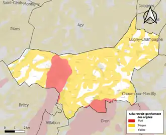 La commune est vulnérable au risque de mouvements de terrains constitué principalement du retrait-gonflement des sols argileux[16]. Cet aléa est susceptible d'engendrer des dommages importants aux bâtiments en cas d’alternance de périodes de sécheresse et de pluie. 76,8 % de la superficie communale est en aléa moyen ou fort (90 % au niveau départemental et 48,5 % au niveau national). Sur les 264 bâtiments dénombrés sur la commune en 2019, 140 sont en aléa moyen ou fort, soit 53 %, à comparer aux 83 % au niveau départemental et 54 % au niveau national. Une cartographie de l'exposition du territoire national au retrait gonflement des sols argileux est disponible sur le site du BRGM[17],[Carte 2].