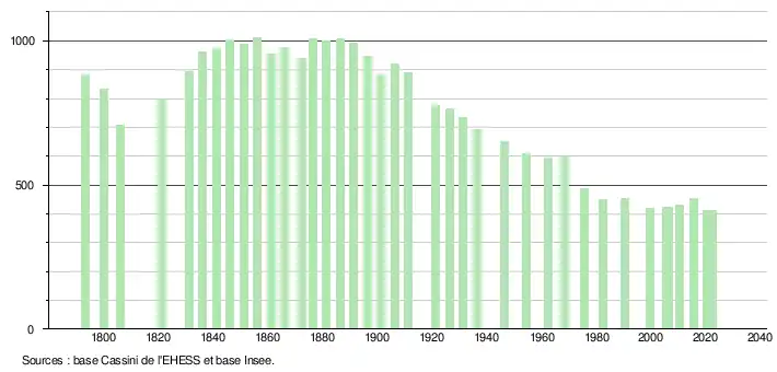 L'évolution du nombre d'habitants est connue à travers les recensements de la population effectués dans la commune depuis 1793. Pour les communes de moins de 10 000 habitants, une enquête de recensement portant sur toute la population est réalisée tous les cinq ans, les populations de référence des années intermédiaires étant quant à elles estimées par interpolation ou extrapolation[20]. Pour la commune, le premier recensement exhaustif entrant dans le cadre du nouveau dispositif a été réalisé en 2005[21].