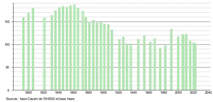 L'évolution du nombre d'habitants est connue à travers les recensements de la population effectués dans la commune depuis 1793. Pour les communes de moins de 10 000 habitants, une enquête de recensement portant sur toute la population est réalisée tous les cinq ans, les populations de référence des années intermédiaires étant quant à elles estimées par interpolation ou extrapolation[36]. Pour la commune, le premier recensement exhaustif entrant dans le cadre du nouveau dispositif a été réalisé en 2005[37].