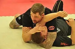 Neil Melanson montre l'étranglement bras-tête durant un entrainement de grappling.