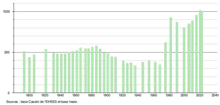 L'évolution du nombre d'habitants est connue à travers les recensements de la population effectués dans la commune depuis 1793. Pour les communes de moins de 10 000 habitants, une enquête de recensement portant sur toute la population est réalisée tous les cinq ans, les populations de référence des années intermédiaires étant quant à elles estimées par interpolation ou extrapolation[33]. Pour la commune, le premier recensement exhaustif entrant dans le cadre du nouveau dispositif a été réalisé en 2005[34].