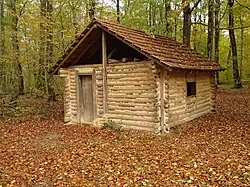 Reconstitution d'un baccu ou bacul, cabane temporaire de chantier des bûcherons charbonniers Il était construit en bois pour une durée de un à deux ans. Lorsque la coupe était finie, le bûcheron démontait le baccu et le réimplantait plus loin[34]. Le charbonnier, comme son nom l'indique, fabrique du charbon de bois (Le charbon de bois provient de la carbonisation du bois, brûlé sans air pendant un certain temps) , en forêt de Chaux le charbon était traditionnellement fabriqué avec le procédé dit de "la meule".