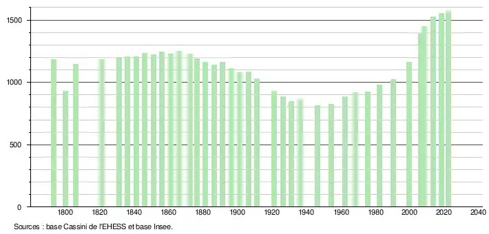 L'évolution du nombre d'habitants est connue à travers les recensements de la population effectués dans la commune depuis 1793. Pour les communes de moins de 10 000 habitants, une enquête de recensement portant sur toute la population est réalisée tous les cinq ans, les populations de référence des années intermédiaires étant quant à elles estimées par interpolation ou extrapolation[20]. Pour la commune, le premier recensement exhaustif entrant dans le cadre du nouveau dispositif a été réalisé en 2008[21].