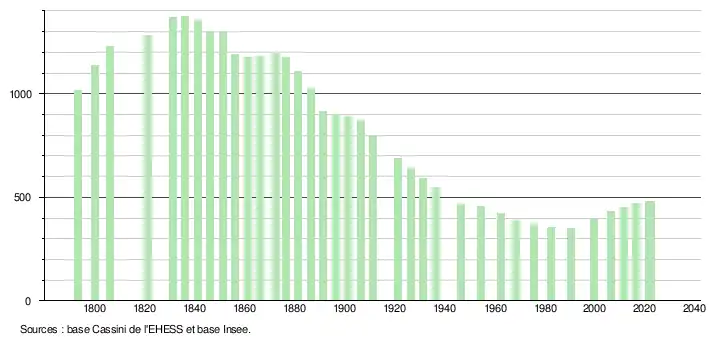 L'évolution du nombre d'habitants est connue à travers les recensements de la population effectués dans la commune depuis 1793. Pour les communes de moins de 10 000 habitants, une enquête de recensement portant sur toute la population est réalisée tous les cinq ans, les populations de référence des années intermédiaires étant quant à elles estimées par interpolation ou extrapolation[20]. Pour la commune, le premier recensement exhaustif entrant dans le cadre du nouveau dispositif a été réalisé en 2006[21].