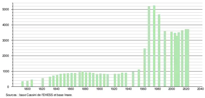 L'évolution du nombre d'habitants est connue à travers les recensements de la population effectués dans la commune depuis 1793. Pour les communes de moins de 10 000 habitants, une enquête de recensement portant sur toute la population est réalisée tous les cinq ans, les populations de référence des années intermédiaires étant quant à elles estimées par interpolation ou extrapolation[25]. Pour la commune, le premier recensement exhaustif entrant dans le cadre du nouveau dispositif a été réalisé en 2004[26].