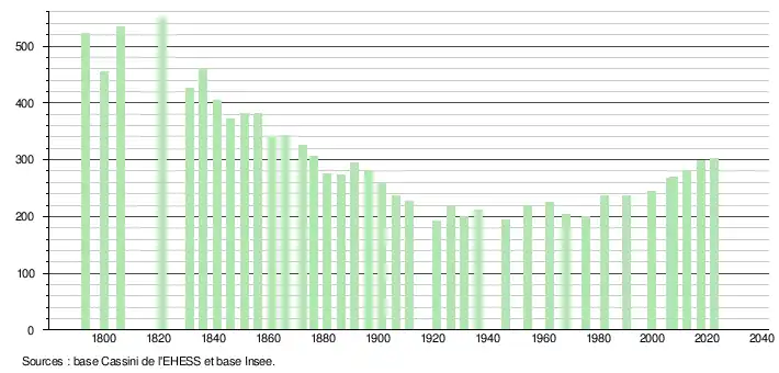 L'évolution du nombre d'habitants est connue à travers les recensements de la population effectués dans la commune depuis 1793. Pour les communes de moins de 10 000 habitants, une enquête de recensement portant sur toute la population est réalisée tous les cinq ans, les populations de référence des années intermédiaires étant quant à elles estimées par interpolation ou extrapolation[24]. Pour la commune, le premier recensement exhaustif entrant dans le cadre du nouveau dispositif a été réalisé en 2007[25].
