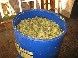 Les porcs ne peuvent pas, contrairement aux ruminants, digérer les tubercules crus, à cause de la présence de facteurs antinutritionnels[1] et de la mauvaise digestibilité de la fécule[2] ; c'est pourquoi les pommes de terre fourragères doivent être cuites avant leur distribution aux animaux. Les pommes de terre cuites peuvent être conservées dans des silos pendant plusieurs mois, ce qui permet d'étaler leur utilisation dans le temps et d'approvisionner régulièrement les élevages.