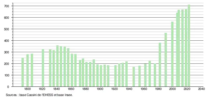 L'évolution du nombre d'habitants est connue à travers les recensements de la population effectués dans la commune depuis 1793. Pour les communes de moins de 10 000 habitants, une enquête de recensement portant sur toute la population est réalisée tous les cinq ans, les populations de référence des années intermédiaires étant quant à elles estimées par interpolation ou extrapolation[18]. Pour la commune, le premier recensement exhaustif entrant dans le cadre du nouveau dispositif a été réalisé en 2008[19].