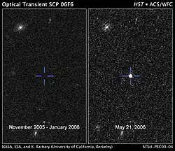 L'apparition soudaine de "l'objet mystérieux" transitoire SCP 06F6 dans le champ de vision de Hubble. L'image du bas représente une vue agrandie.