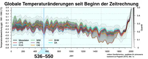 - ↑ (en) Ulf Büntgen, Vladimir S. Myglan, Fredrik Charpentier Ljungqvist, Michael McCormick, Nicola Di Cosmo, Michael Sigl, Johann Jungclaus, Sebastian Wagner, Paul J. Krusic et Jan Esper, Jed O. Kaplan, Michiel A. C. de Vaan, Jürg Luterbacher, Lukas Wacker, Willy Tegel & Alexander V. Kirdyanov, « Cooling and societal change during the Late Antique Little Ice Age from 536 to around 660 AD », Nature Geoscience, no 9, , p. 231–236 (ISSN 1752-0894, DOI 10.1038/ngeo2652, sur dx.doi.org, lire en ligne)