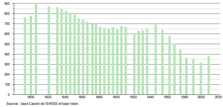 - ↑ Dans le tableau des recensements et le graphique, par convention dans Wikipédia, le principe a été retenu, pour les populations légales postérieures à 1999 de n’afficher dans le tableau des recensements et le graphique que les populations correspondant à l'année 2006, première population légale publiée calculée conformément aux concepts définis dans le décret no 2003-485 du 5 juin 2003, et les années correspondant à une enquête exhaustive de recensement pour les communes de moins de 10 000 habitants, ainsi que la dernière population légale publiée par l’Insee.