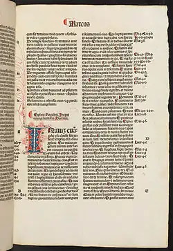 Première page de l'Évangile selon Marc, manuscrit latin, 1486.