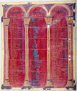 - f6r - 11v : tables Canon, sur papier vélin teint en pourpre, lettrées en or et argent (mal oxydé), avec des entourages à arcades en or et argent.