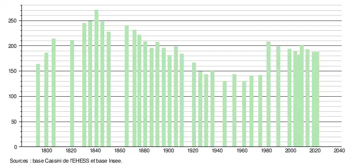 L'évolution du nombre d'habitants est connue à travers les recensements de la population effectués dans la commune depuis 1793. Pour les communes de moins de 10 000 habitants, une enquête de recensement portant sur toute la population est réalisée tous les cinq ans, les populations de référence des années intermédiaires étant quant à elles estimées par interpolation ou extrapolation[18]. Pour la commune, le premier recensement exhaustif entrant dans le cadre du nouveau dispositif a été réalisé en 2004[19].