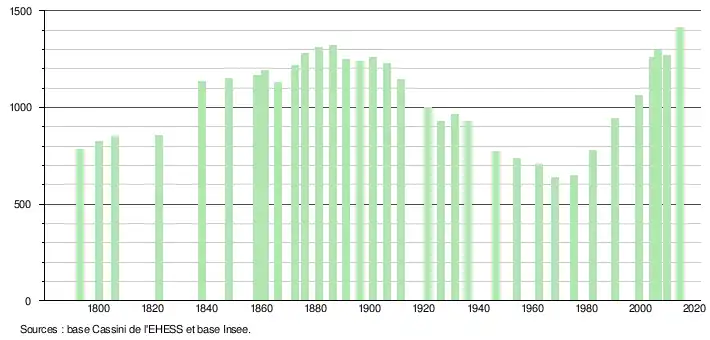 L'évolution du nombre d'habitants est connue à travers les recensements de la population effectués dans la commune depuis 1793. Pour les communes de moins de 10 000 habitants, une enquête de recensement portant sur toute la population est réalisée tous les cinq ans, les populations de référence des années intermédiaires étant quant à elles estimées par interpolation ou extrapolation[6]. Pour la commune, le premier recensement exhaustif entrant dans le cadre du nouveau dispositif a été réalisé en 2004[7].