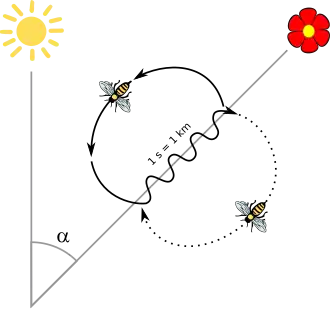 Il a été montré que les abeilles sont capables de se communiquer l’emplacement de sources de nourritures particulièrement riches en effectuant des mouvements répétitifs en forme de huit (cf. Figure 18). Ce comportement, appelé danse des abeilles, leur permet d’indiquer à leur congénères la distance et la direction de la source de nourriture ce qui permet d’améliorer la recherche de nourriture. Ce comportement est particulièrement présent dans les habitats où la nourriture est dispersée de manière hétérogène et particulièrement dans les habitats tropicaux[62].