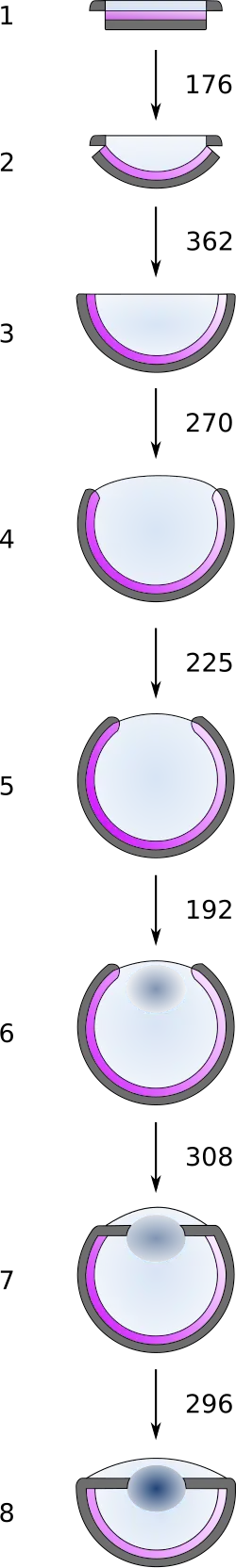 Nilsson et Pelger[28] ont considéré l’émergence de l’œil comme une succession d’étapes transformant à la fois la physiologie et la morphologie de l’élément récepteur en 1829 étapes à travers 350,000 générations soit 500,000 ans (cf. figure 4). La première innovation est décrite comme l’initiation de cellules photosensibles se développant entre des cellules transparentes et cellules pigmentées. La sensibilisation aux variations lumineuses confère un avantage évolutif dans l’appréhension de l’espace qui a permis aux gastéropodes tels que les patelles d’effectuer des ascensions verticales afin de se nourrir.