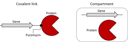 Lorsque les protéines fonctionnelles ont été isolées, il est nécessaire que leurs gènes le soient aussi ; en conséquence, un lien génotype-phénotype est requis[16]. Ce lien peut être covalent, comme dans l'affichage d'ARNm où le gène de l'ARNm est lié à la protéine par la puromycine à la fin de la traduction[4]. Autrement, la protéine et son gène peuvent être co-localisés par compartimentalisation dans les cellules vivantes[18] ou dans des gouttelettes d'émulsion[19]. Les séquences géniques isolées sont ensuite amplifiées par PCR ou par des bactéries-hôtes transformées. On peut utiliser soit la meilleure séquence, soit un groupe de séquences, en tant que modèles pour le cycle suivant de mutagénèse. Les cycles répétés de diversification-sélection-amplification génèrent des variants protéiques adaptés aux pressions de sélection appliquées.